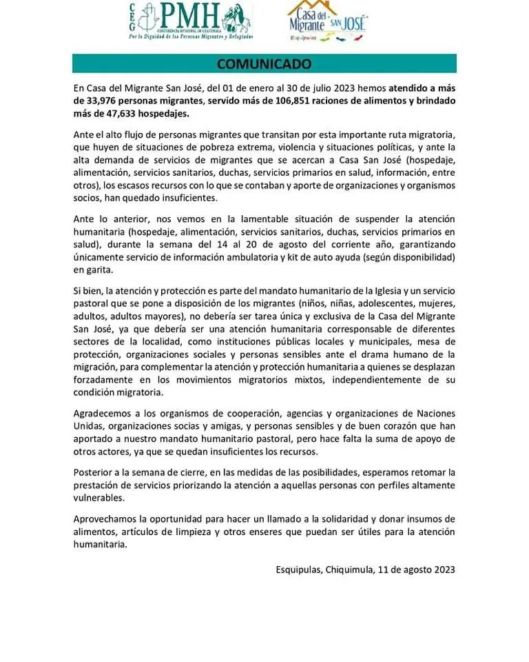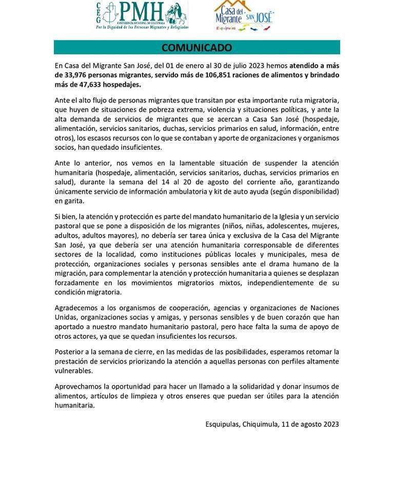 Comunicado de importancia de la situación actual de la Casa del Migrante publicado el 11 de agosto de 2023