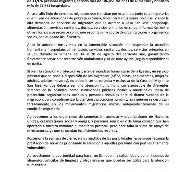 Comunicado de importancia de la situación actual de la Casa del Migrante publicado el 11 de agosto de 2023