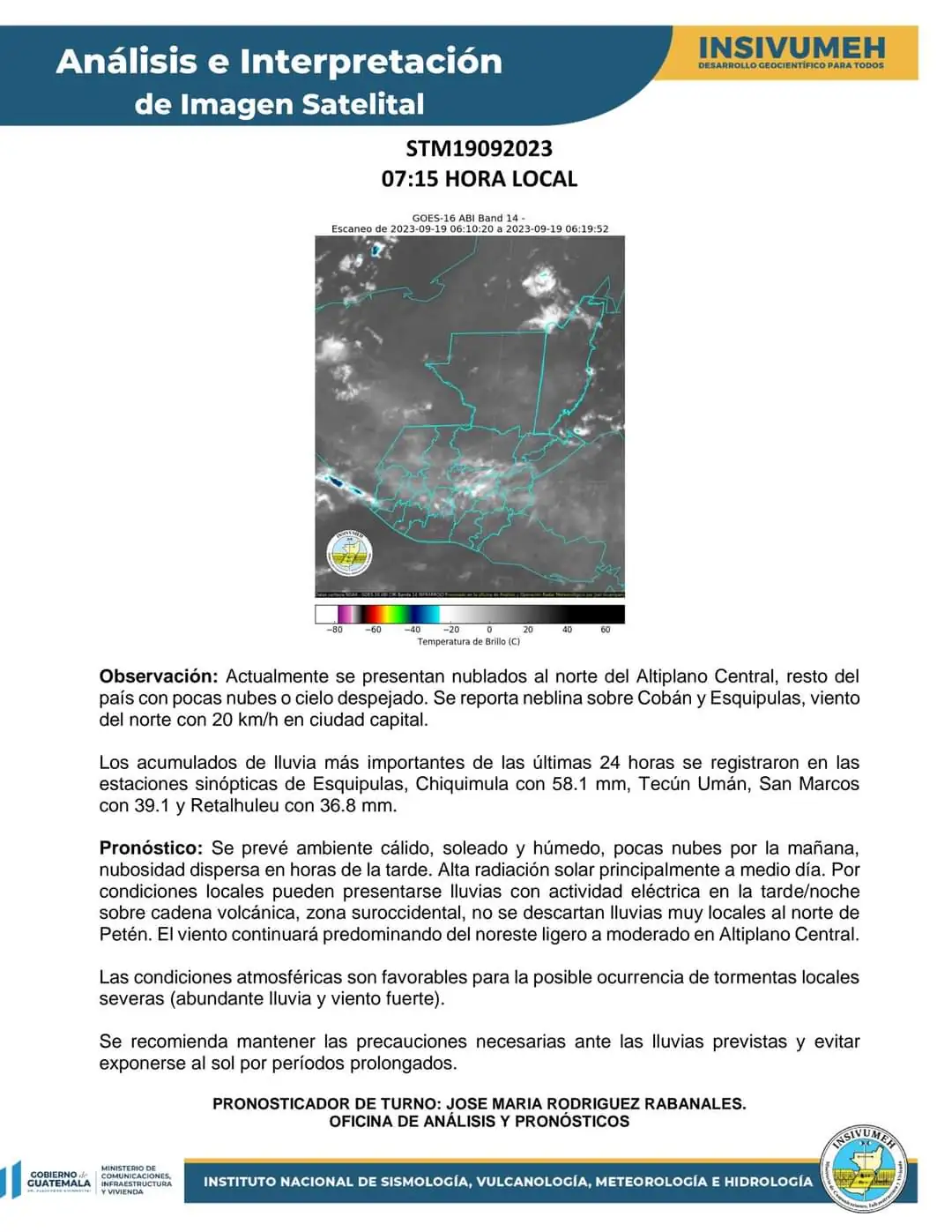 Observación: Actualmente se presentan nublados desde el sur al centro del país, poca nubosidad sobre las regiones Occidente, Norte y parte de la zona oeste de Pacífico. Se reporta neblina en Alta Verapaz y Chiquimula, nubes de tormenta con lluvias en Izabal yviento noreste entre los 10 a 20 km/h en ciudad capital.