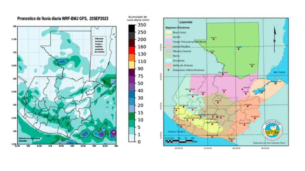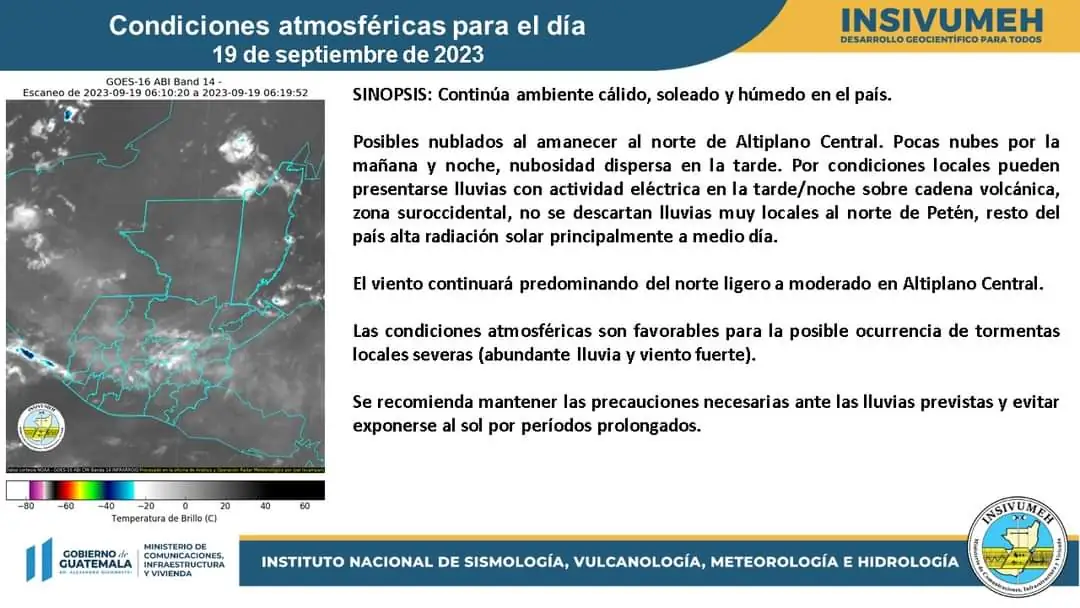 Pronóstico: La leve entrada de humedad desde ambos litorales promoverá nublados con lluvias dispersas sobre las regiones Bocacosta, Altiplano Central, Norte y Caribe, sin descartar lluvias de carácter local sobre el resto del país.