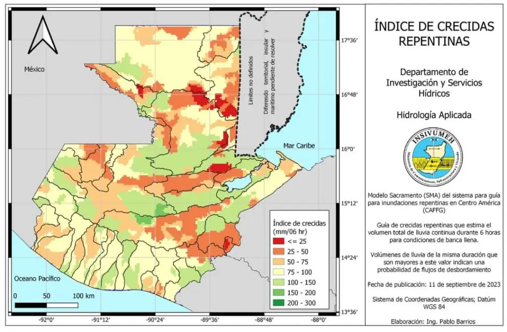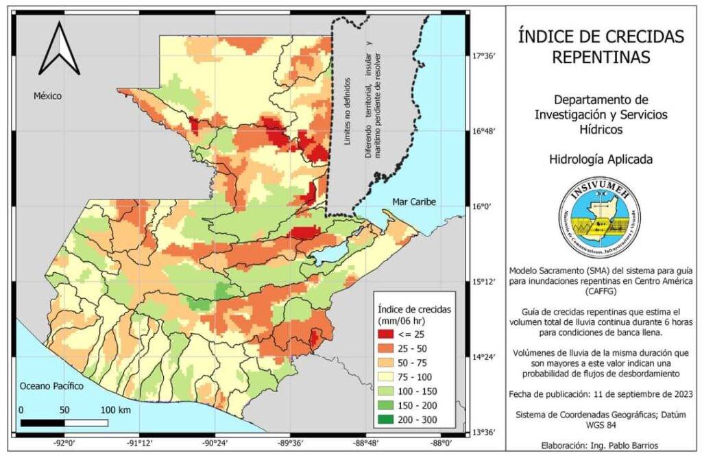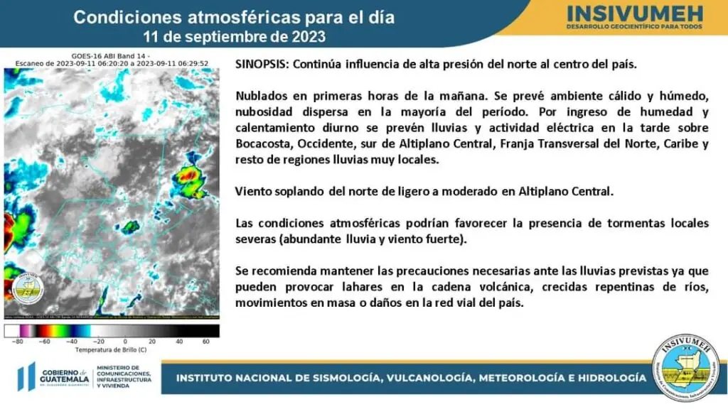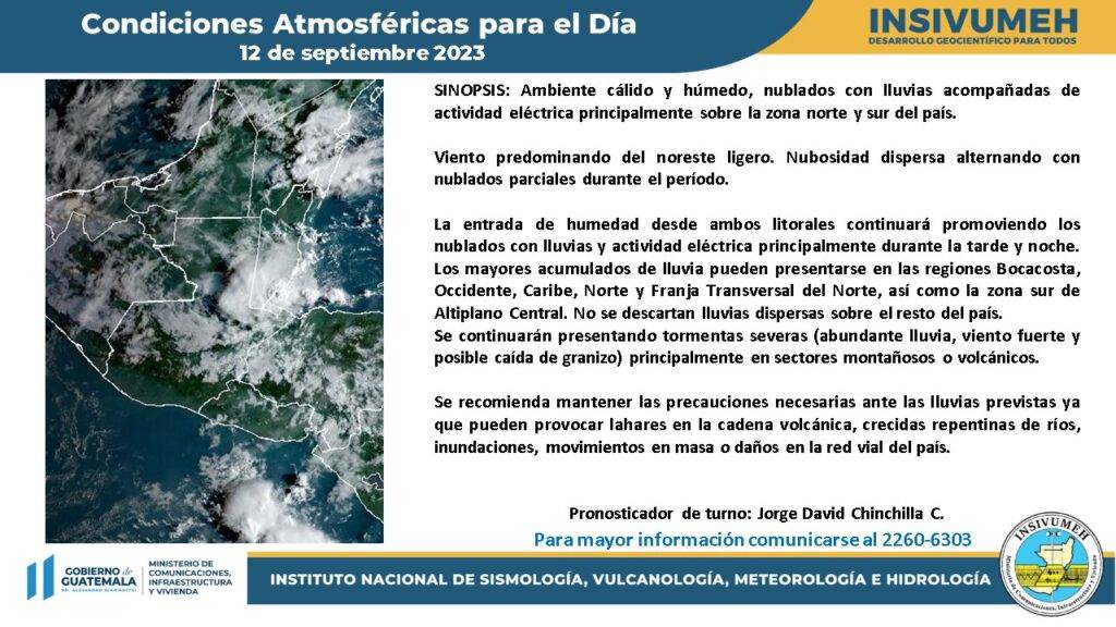 Los mayores acumulados de lluvia pueden presentarse en las regiones Bocacosta, Occidente, Caribe, Norte y Franja Transversal del Norte, así como la zona sur de Altiplano Central. No se descartan lluvias dispersas sobre el resto del país. Se continuarán presentando tormentas severas (abundante lluvia, viento fuerte y posible caída de granizo) principalmente en sectores montañosos o volcánicos.