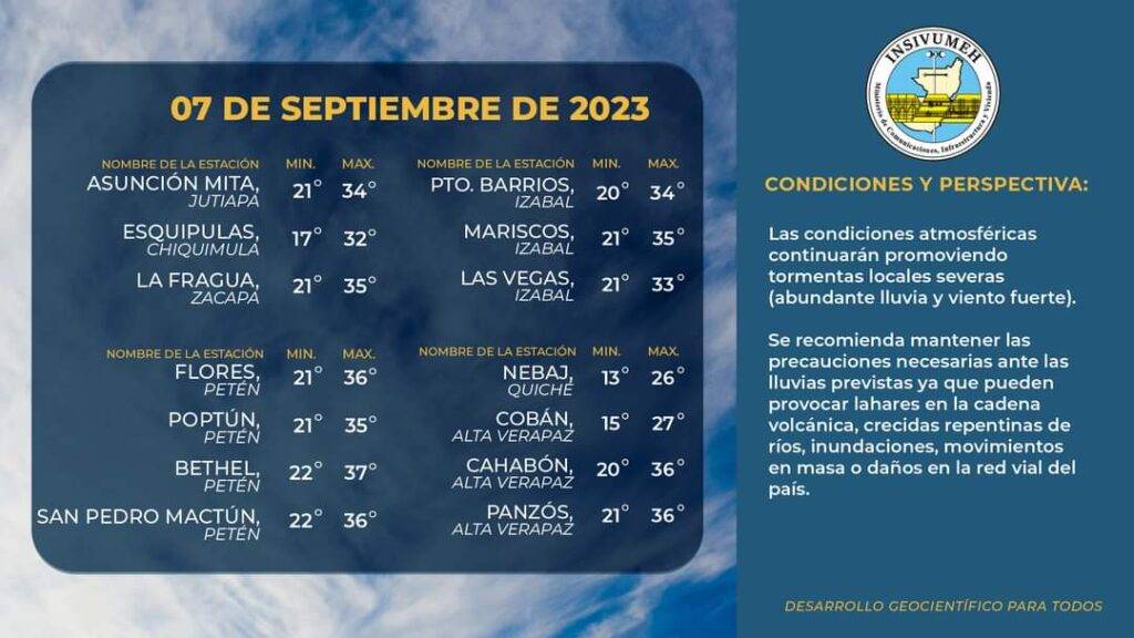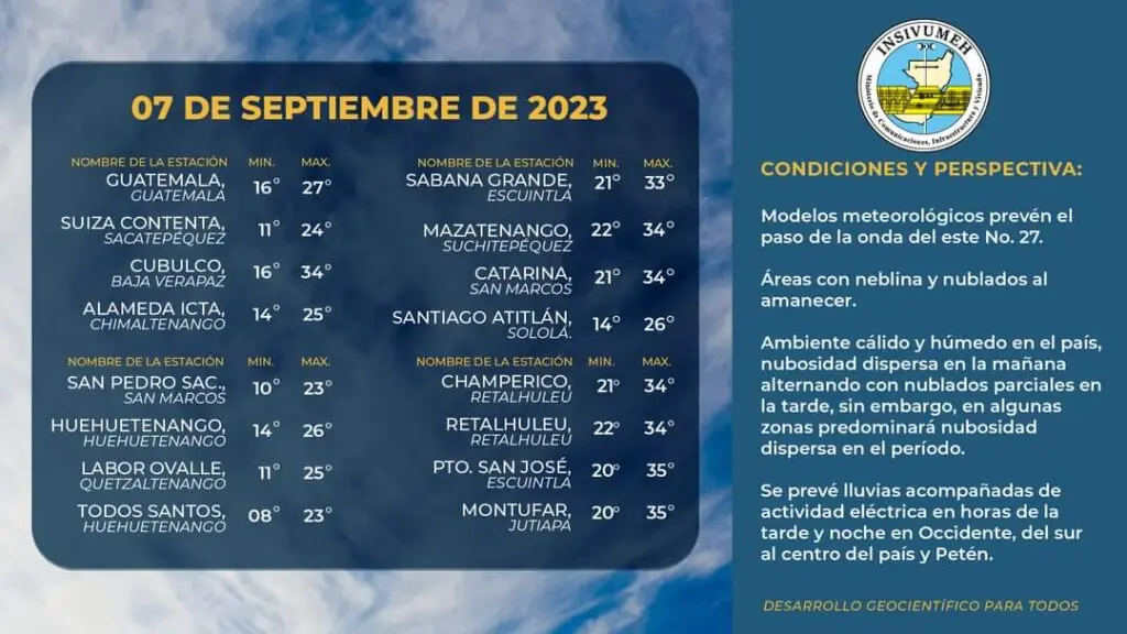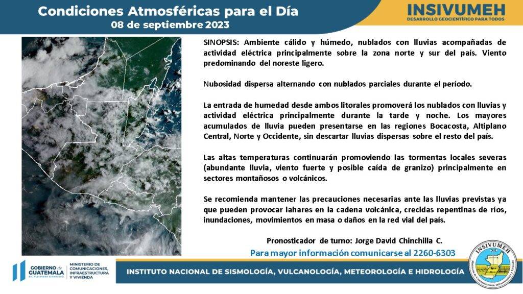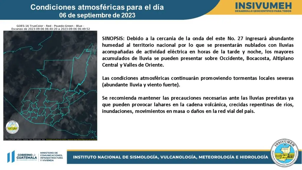 Se prevé lluvias acompañadas de actividad eléctrica en horas de la tarde y noche en Occidente, del sur al centro del país y Petén.