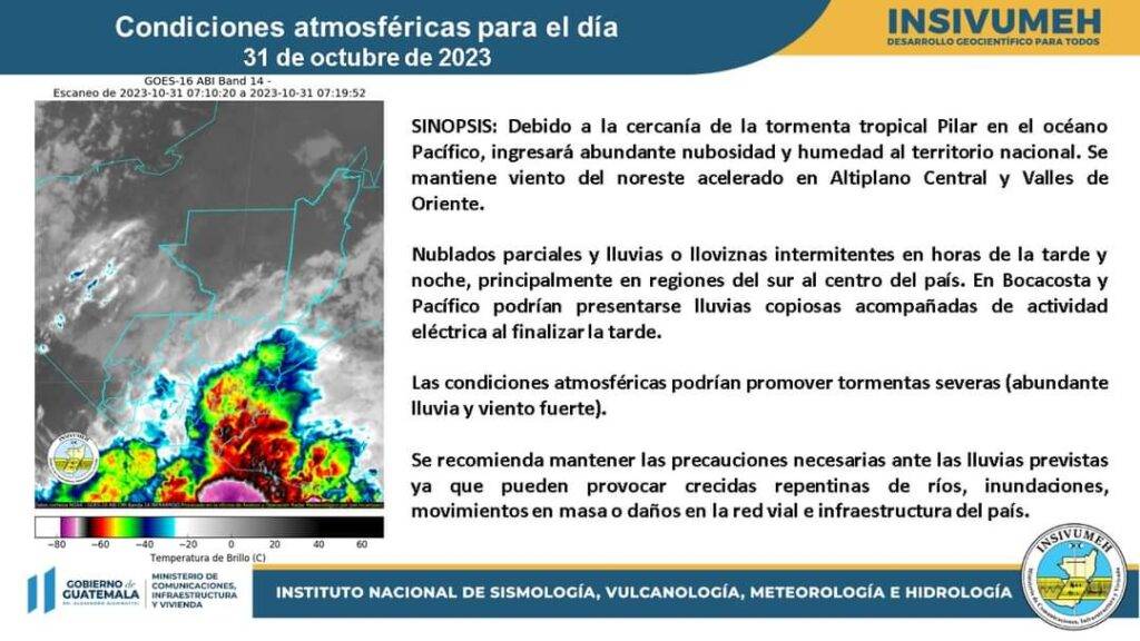 Se monitorea la actividad ciclónica del mar Caribe y un sistema de alta presión asociado a un frente frío al norte del golfo de México. No se descarta el desarrollo de un ciclón tropical al final de la semana, sin embargo, por el momento no representa peligro para el país. El frente frío y sistema de alta presión se acercarán a nuestro país incrementando las lluvias y la velocidad del viento norte a partir del martes sobre la zona norte del territorio nacional (Petén, Franja Transversal del Norte y Caribe).