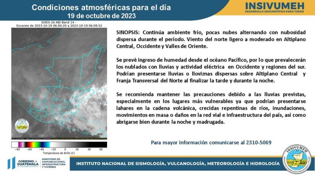 Observación: Actualmente se presenta abundante nubosidad sobre el mar Caribe, Occidente oeste de Petén y parte de Franja Transversal del Norte, nubosidad dispersa sobre Altiplano Central y Valles de Oriente, pocas nubes sobre el resto del país. Se reporta niebla en Alta Verapaz, lluvias al norte de Izabal y viento del noreste entre los 25 a 35 km/h en ciudad capital.