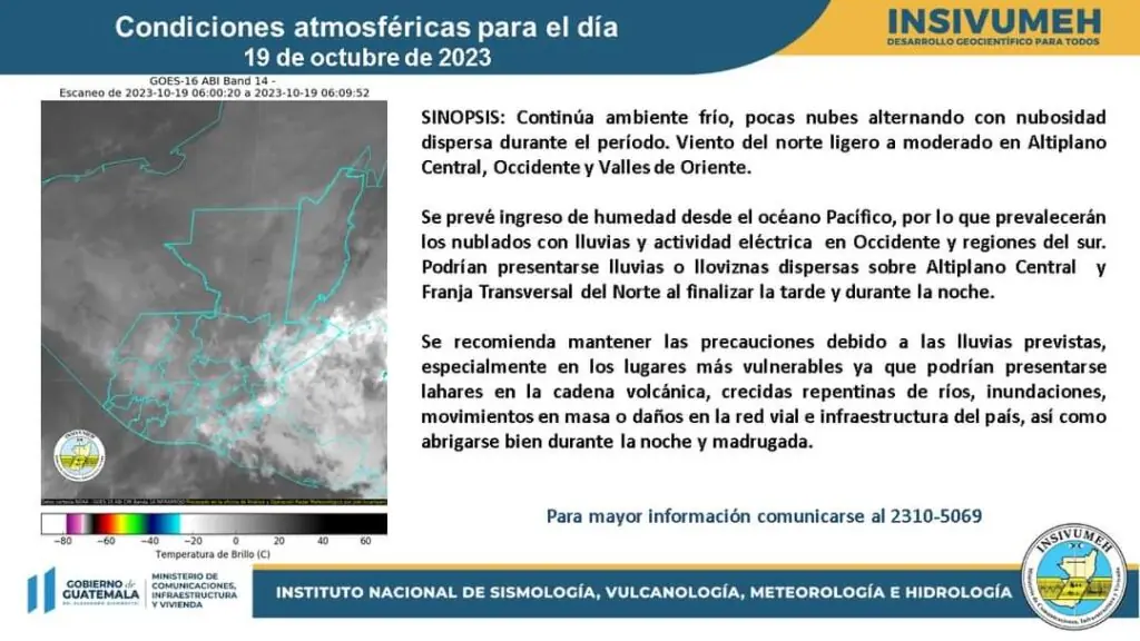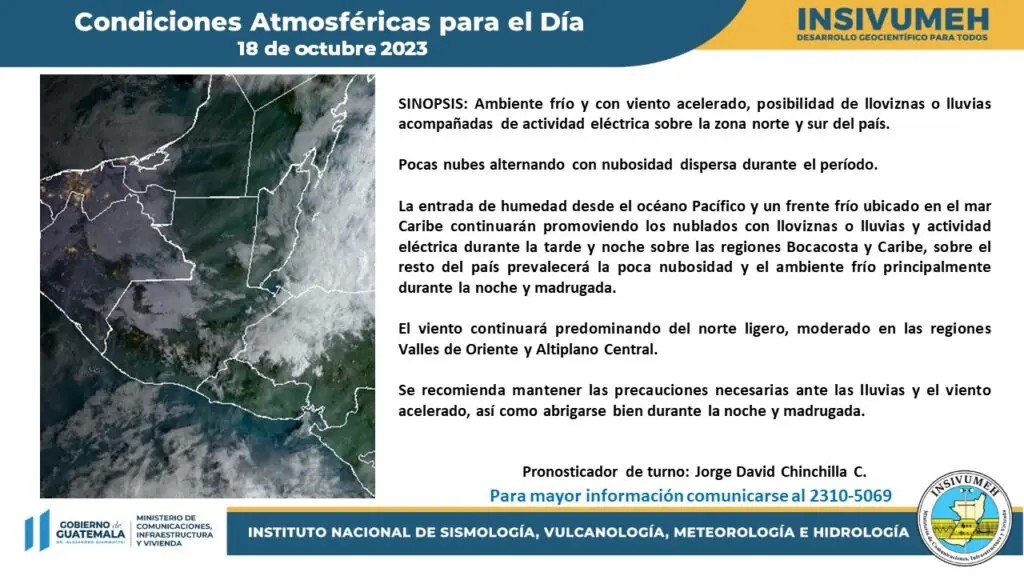 Condiciones y perspectiva: Amanecer con nublados y posibles lloviznas en sectores montañosos. Pocas nubes alternando con nubosidad dispersa durante el período. La entrada de humedad desde el océano Pacífico y un frente frío ubicado en el mar Caribe continuarán promoviendo los nublados con lloviznas o lluvias y actividad eléctrica durante la tarde y noche sobre las regiones Bocacosta y Caribe, sobre el resto del país prevalecerá la poca nubosidad y el ambiente frío principalmente durante la noche y madrugada. El viento continuará predominando del norte ligero, moderado en las regiones Valles de Oriente y Altiplano Central.