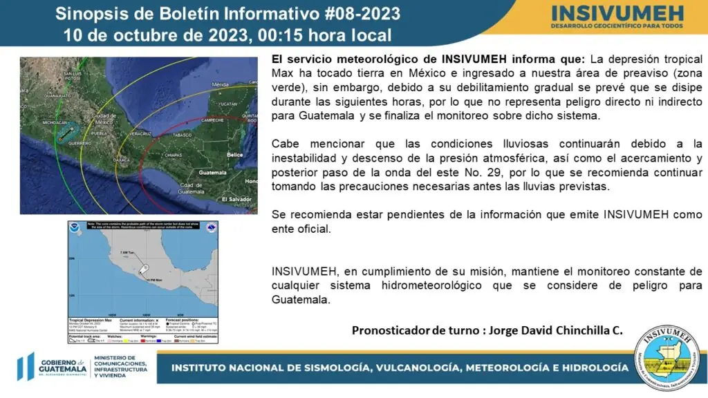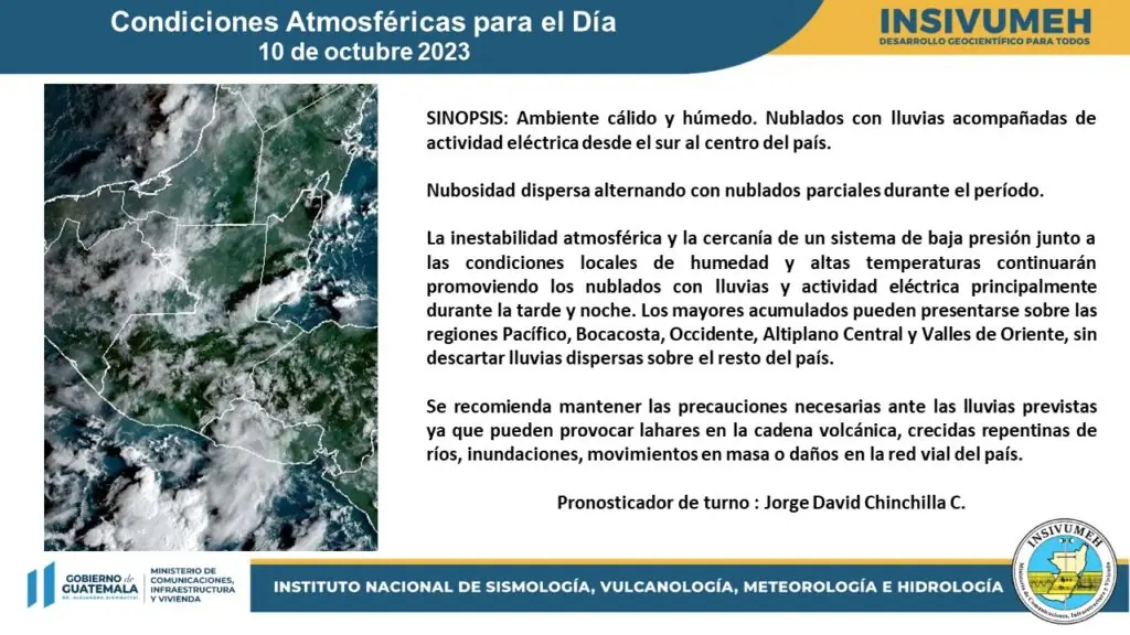 Los mayores acumulados pueden presentarse sobre las regiones Pacífico, Bocacosta, Occidente, Altiplano Central y Valles de Oriente, sin descartar lluvias dispersas sobre el resto del país.