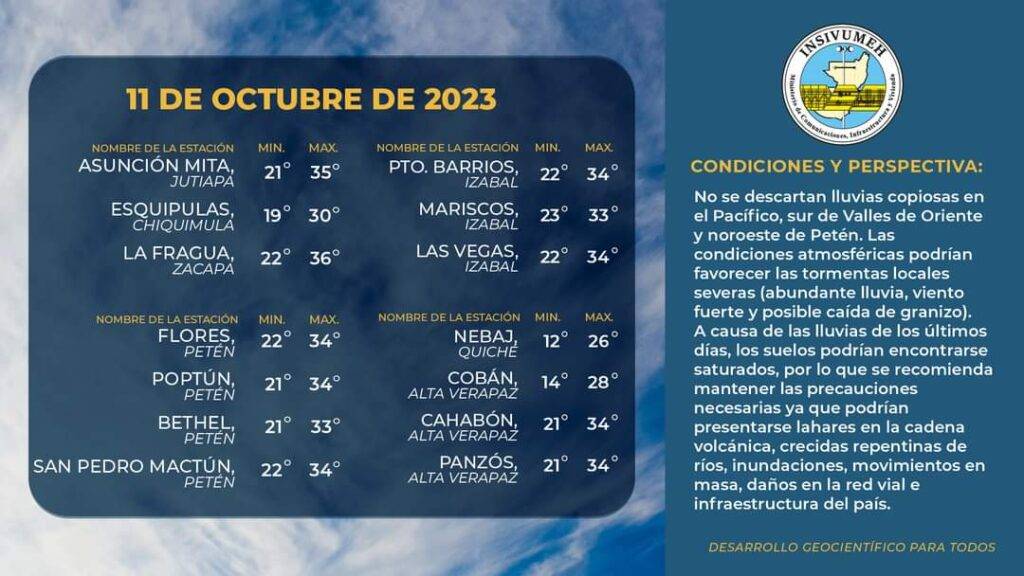 con nubosidad dispersa sobre el resto del país. Se reporta neblina o niebla en Chiquimula, Quetzaltenango y Guatemala, nubes de tormenta en Retalhuleu y tormenta eléctrica en Izabal.
