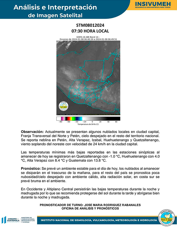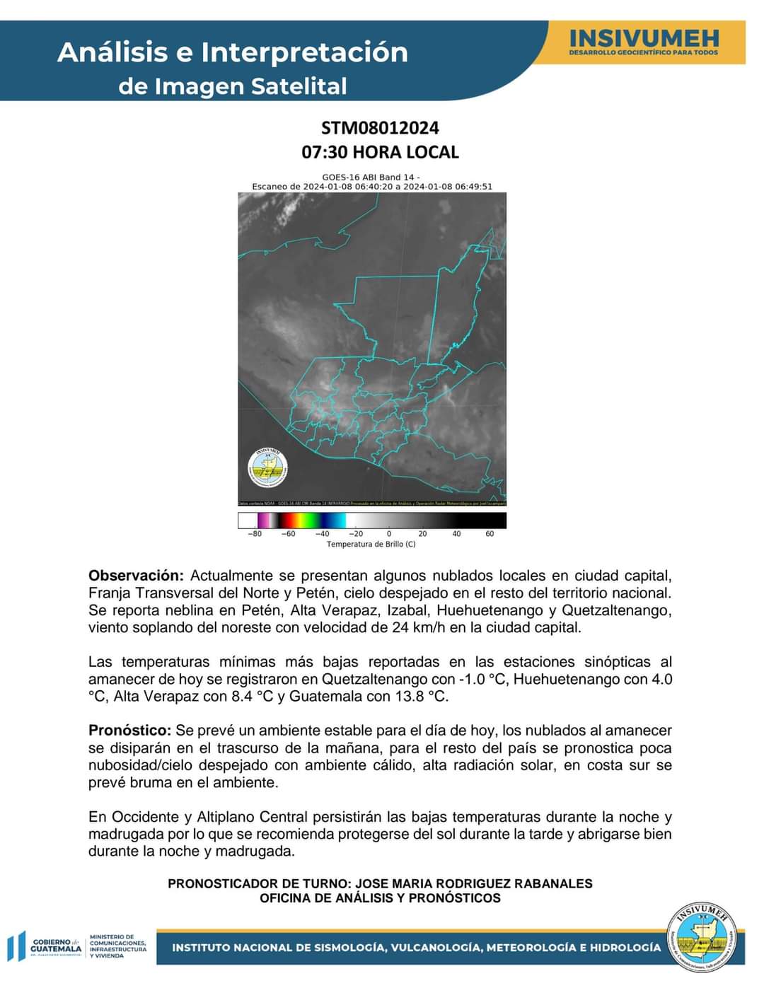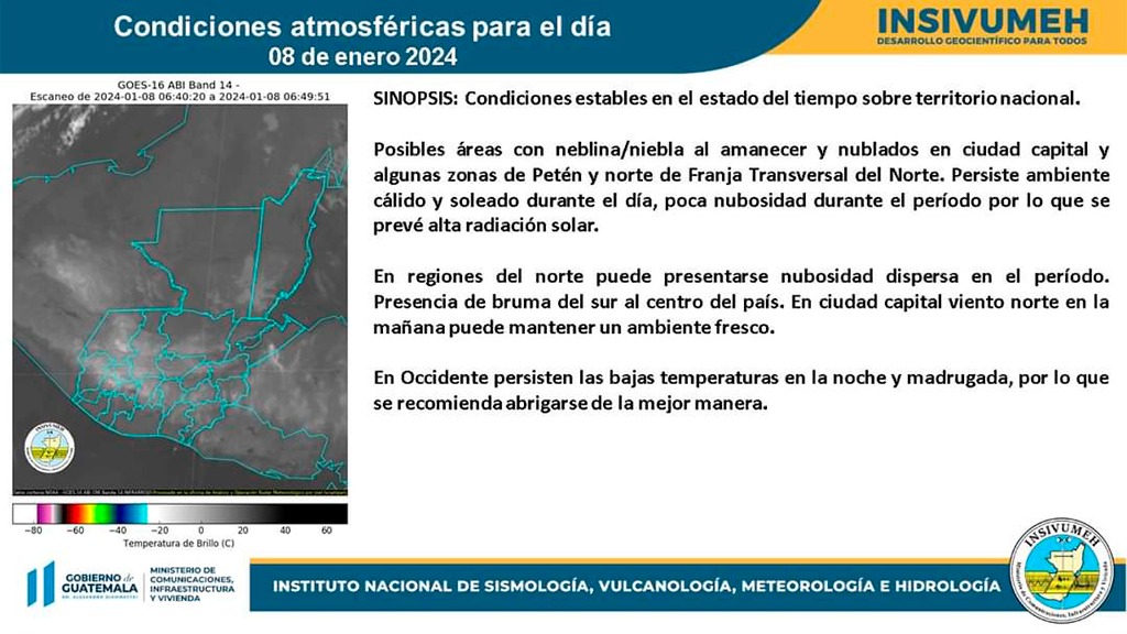 Estas son las condiciones climáticas para este 8 de enero de 2024 en Guatemala, en donde se prevé un ambiente estable para el día este día. Los nublados al amanecer se dispersan en el transcurso de la mañana, para el resto del país se pronostica poca nubosidad/cielo despejado.