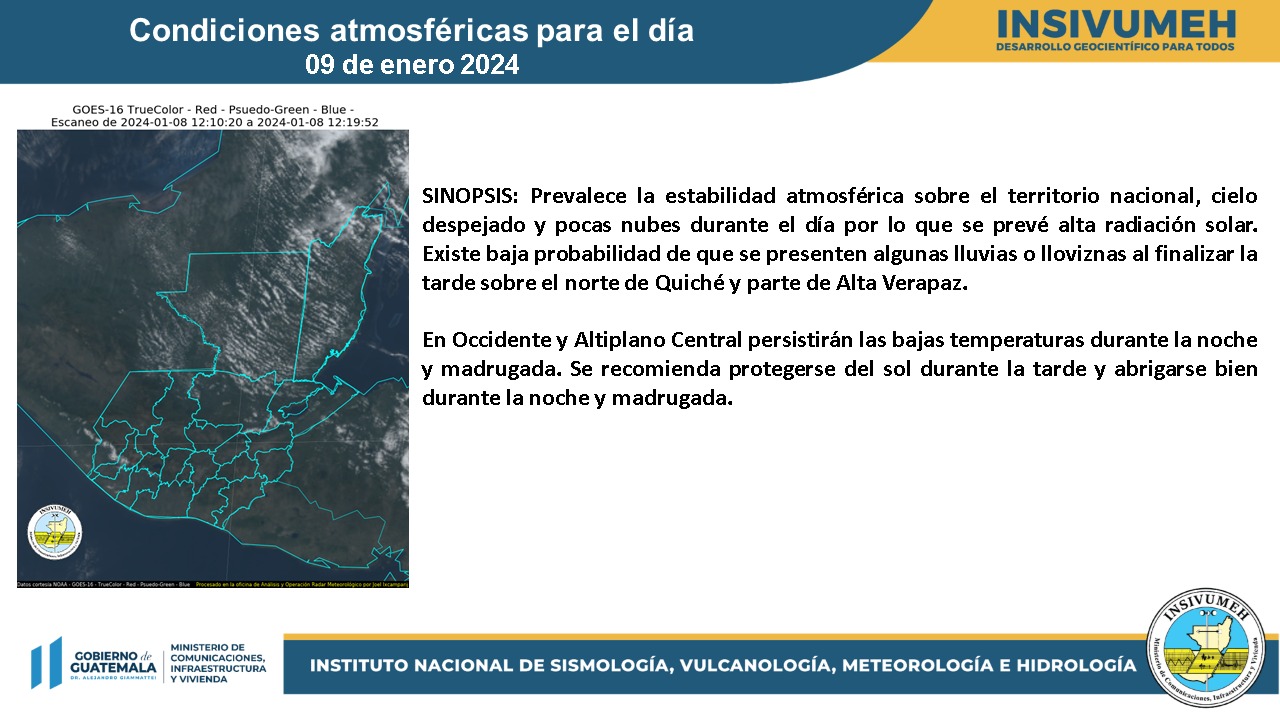 Conoce las condiciones climáticas para el territorio nacional para el día de hoy 9 de enero de 2024, datos recopilados de INSIVUMEH.