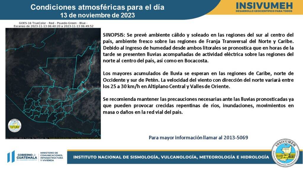 Los mayores acumulados de lluvia se esperan en las regiones de Caribe, norte de Occidente y sur de Petén. La velocidad del viento con dirección del norte variará entre los 25 a 30 km/h en Altiplano Central y Valles de Oriente.